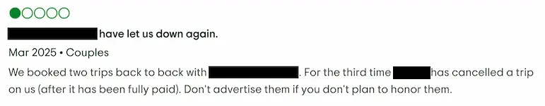 “For the third time [tour operator] has cancelled a trip on us (after it has been fully paid). Don’t advertise them if you don’t plan to honor them.”